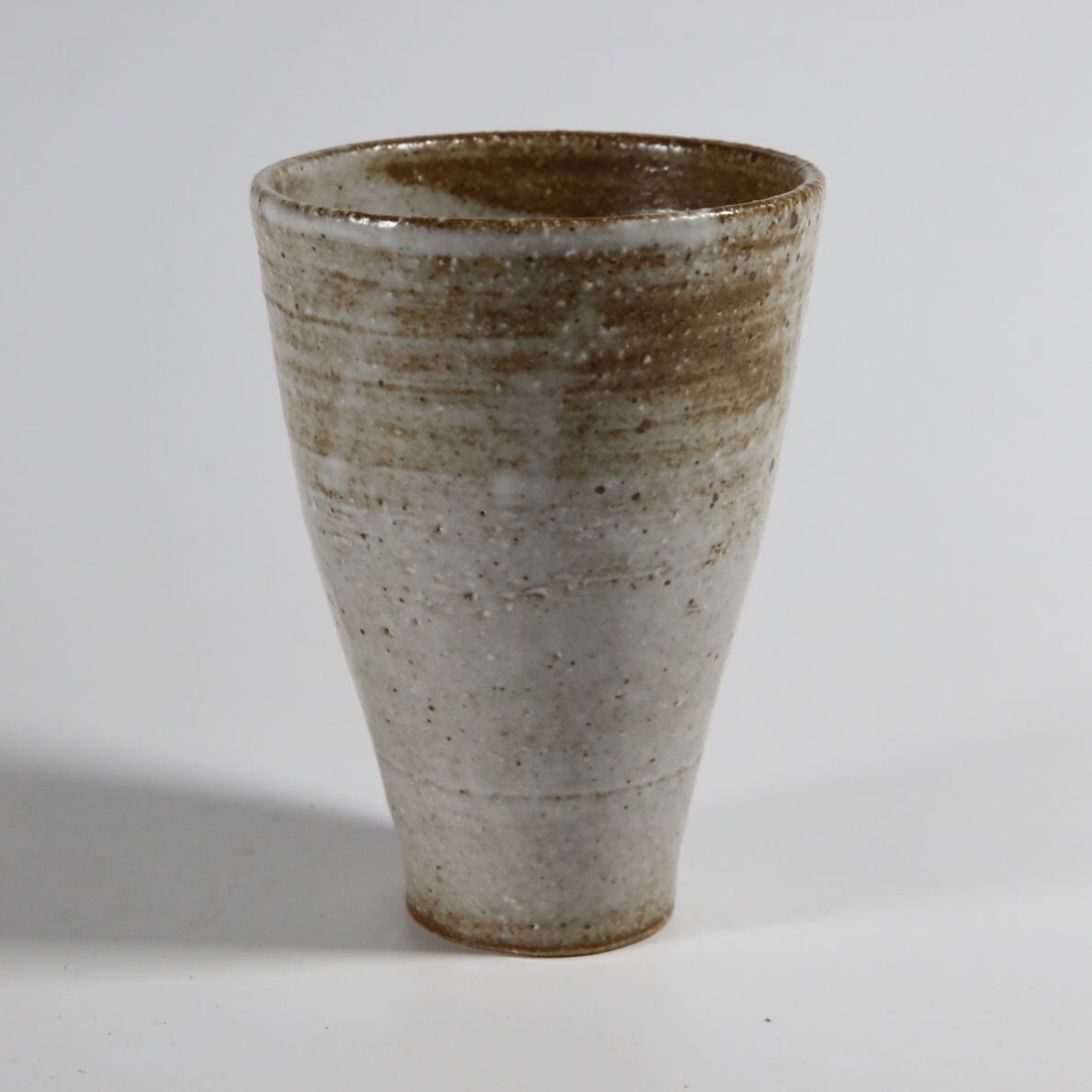 信楽の赤土にマット調の白釉を掛け、1250度で還元焼成焼しています。還元焼成することで粘土の鉄分と雲母が反応し、器ごとに個性的な模様が浮かび上げっています。ほんの少し緑がかったグレーという色調で、全体に優しい雰囲気の器です。陶器の器で飲むビールはシルキーな泡のきめ細かさが特徴です。